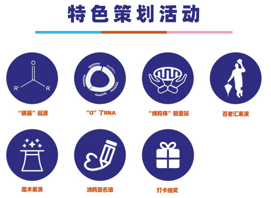 "線粒體"能量站;“碳基”起源;"O"了RNA。穿插了各色活動如百老匯舞蹈表演;魔術(shù)表演;打卡抽獎等,以調(diào)動展會的趣味與互動性。
