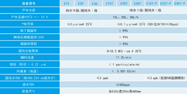 ·E系列機型采用ABS機殼,7寸電容觸摸屏,獨立取水手臂,可選配EDI模塊、 在線TOC檢測模塊,以自來水為進水,可生產(chǎn)優(yōu)質、高效、持續(xù)、穩(wěn)定的純水(Ⅲ級/Ⅱ級)、超純水(Ⅰ級),產(chǎn)水量10-30L/h,可滿足多樣化的實驗需求。