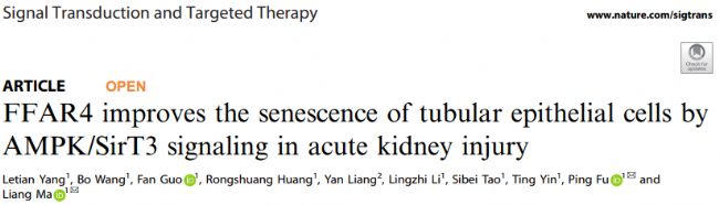 四川大學(xué)馬良和付平研究團(tuán)隊(duì)在《Signal Transduction and Targeted Therapy》發(fā)表題為“FFAR4 improves the senescence of tubular epithelial cells by AMPK/SirT3 signaling in acute kidney injury”文章。