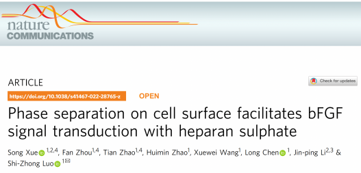 北京化工大學(xué)羅施中教授團(tuán)隊(duì)在《Nature Communications》上發(fā)表題為“Phase separation on cell surface facilitates bFGF signal transduction with heparan sulphate”文章。