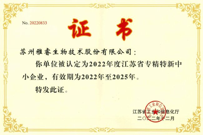 祝賀雅睿生物獲得“江蘇省專精特新中小企業(yè)”認(rèn)定
