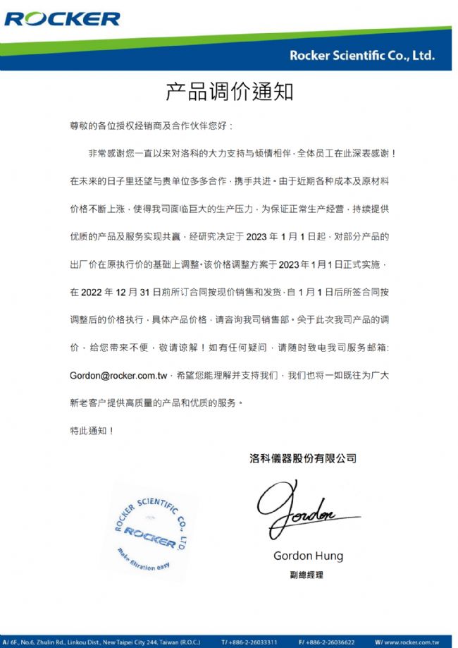 非常感謝您一直以來對(duì)洛科的大力支持與傾情相伴,全體員工在此深表感謝!在未來的日子里還望與貴單位多多合作,攜手共進(jìn)。由于近期各種成本及原材料價(jià)格不斷上漲,使得我司面臨巨大的生產(chǎn)壓力,為保證正常生產(chǎn)經(jīng)營(yíng),持續(xù)提供優(yōu)質(zhì)的產(chǎn)品及服務(wù)實(shí)現(xiàn)共贏,經(jīng)研究決定于 2023 年 1 月 1 日起,對(duì)部分產(chǎn)品的出廠價(jià)在原執(zhí)行價(jià)的基礎(chǔ)上調(diào)整。該價(jià)格調(diào)整方案于2023年1月1日正式實(shí)施,在 2022 年 12 月 31 日前所訂合同按現(xiàn)價(jià)銷售和發(fā)貨,自 1 月 1 日后所簽合同按調(diào)整后的價(jià)格執(zhí)行,具體產(chǎn)品價(jià)格,請(qǐng)咨詢我司銷售部。關(guān)于此次我司產(chǎn)品的調(diào)價(jià),給您帶來不便,敬請(qǐng)諒解!如有任何疑問,請(qǐng)隨時(shí)致電我司服務(wù)郵箱: