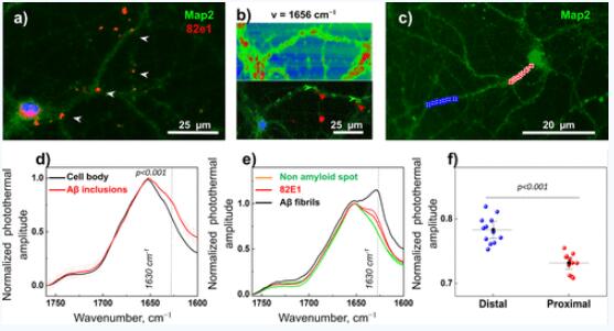 在第三個實驗中,作者研究了 FL-OPTIR 在培養(yǎng)的原代神經(jīng)元中 Aβ結(jié)構(gòu)成像的適用性。與組織研究類似,淀粉樣蛋白的結(jié)構(gòu)異質(zhì)性使得研究神經(jīng)毒性與 Aβ 結(jié)構(gòu)之間的關(guān)系仍具有挑戰(zhàn)性。因此,為了直接評估神經(jīng)元中的淀粉樣蛋白結(jié)構(gòu),作者使用FL-OPTIR技術(shù)基于熒光信號引導(dǎo)的光譜測量,發(fā)現(xiàn)遠(yuǎn)端比近端神經(jīng)突部分(分支后)相關(guān)的 Aβ 包含更多的 Aβ-聚集體, 作者認(rèn)為這些神經(jīng)元隔室可能本質(zhì)上更容易結(jié)合 Aβ或者能夠主動運輸?shù)竭h(yuǎn)端。