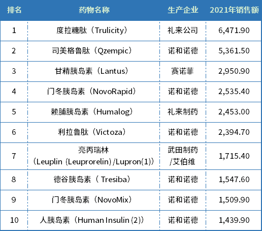 全球多肽藥物銷售額 TOP10