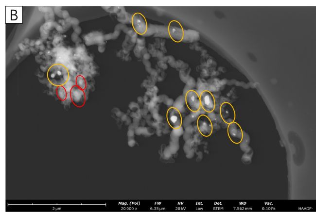 在掃描電鏡的 SED 圖中可以直觀顯示碳納米管的粗細(xì),以及碳納米管之間的交織狀態(tài)。但是在 STEM 圖中,可以看到隱藏在 3D 結(jié)構(gòu)中的小顆粒,這些顆粒在 SEM 圖中是無法看到的。