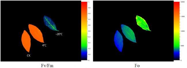 對低溫處理的茶苗葉片進行熒光成像分析,結果顯示-20℃低溫處理20min后的茶苗葉片,細胞可能破碎,葉綠體溢出,F(xiàn)o顯著高于CK對照和4℃處理組。Fv/Fm也明顯降低,其光合能力逐漸喪失。而4℃處理20min對葉片光合的影響仍較輕。
