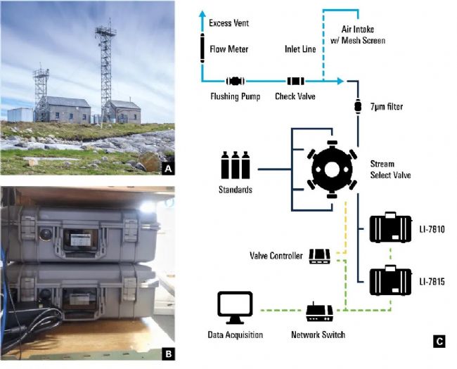 A 梅斯黑德大氣研究站;B LI-7810和LI-7815氣體分析儀;C是氣體樣品測(cè)量氣路和校準(zhǔn)裝置。A圖由Gavin Kelly拍攝,版權(quán)所有 Colin O'Dowd,LI-COR有轉(zhuǎn)載授權(quán)(2020)