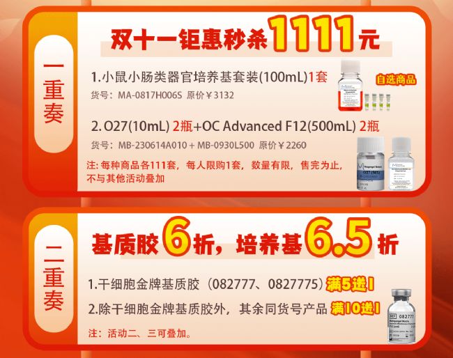 【雙11狂歡購】類器官培養(yǎng)基套裝1111元帶回家! 燃爆雙十一,還得看;! 1111元商品搶購、超低折扣、有買有送 轉發(fā)集贊更有;苓呑赃x! 心動不如行動,快聯(lián)系區(qū)域銷售下單訂購吧! 購買;,科研更順心! 這波可以沖。!