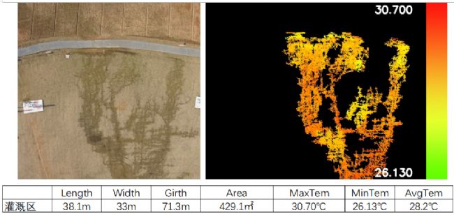 基于易科泰Thermo-RGB融合分析軟件,對地物中灌溉區(qū)進行可見光與紅外熱成像數(shù)據融合分析處理,如下圖為掩膜顯示結果,并統(tǒng)計其形狀、面積和溫度等信息,可以精確反映不同地物覆蓋情況和溫度分布。