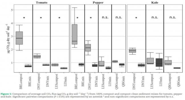 下圖為康奈爾大學綜合植物科學學院科研人員利用該系統(tǒng)研究了來自紐約不同地方的100%堆肥和50:50堆肥與清潔沉積物混合物添加對番茄、辣椒和羽衣甘藍土壤CO2通量的影響(J Garcia, N Bray, Y Son, A Butler-Jones, S P Egendorf, J Kao-Kniffin, Plant growth and microbial responses from urban