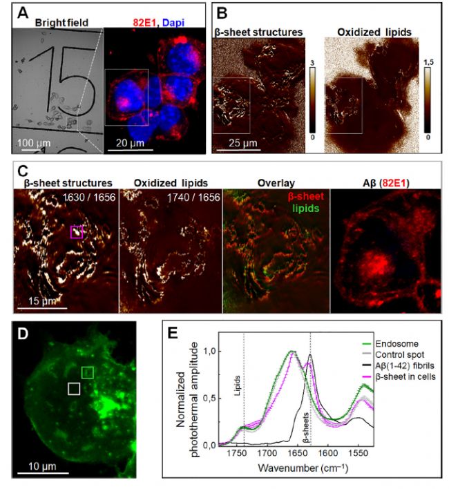 圖8 無(wú)熒光標(biāo)記條件下單個(gè)細(xì)胞的O-PTIR顯微光譜及成像分析
