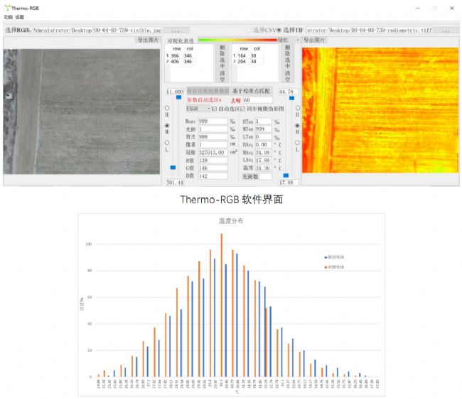 下圖為由易科泰自主開發(fā)的Themo-RGB融合分析軟件,將土壤背景濾除,對不同處理的植被進(jìn)行溫度統(tǒng)計的結(jié)果。