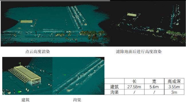 同時,三維點(diǎn)云數(shù)據(jù)很好展示了地物的三維信息,由于小麥剛出芽,所以主要通過建筑和溝渠展示地物的三維信息。