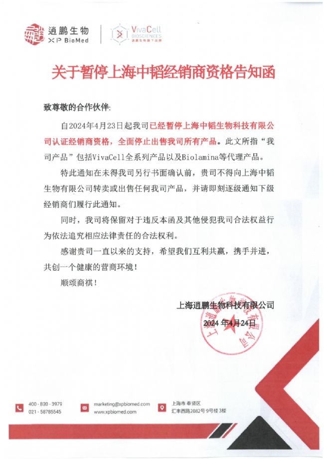 自2024年4月23日起我司已經(jīng)暫停上海中韜生物科技有限公司認(rèn)證經(jīng)銷商資格,全面停止出售我司所有產(chǎn)品。此文所指‘’我司產(chǎn)品‘’包括VivaCell全系列產(chǎn)品以及Biolamina等代理產(chǎn)品。