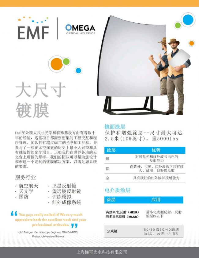 EMF在處理大尺寸光學和特殊基板方面有著數(shù)十年的經(jīng)驗,這些項目都需要密集的工程交互和程序管理。團隊擁有超過八十年的光學加工經(jīng)驗,并參與了一些在太空探索的歷史上最令人興奮和具有挑戰(zhàn)性的光學項目。正如我們在世界各地的天文臺上所做的一樣。我們的團隊可以幫助您設計和創(chuàng)建一個定制的鍍膜解決方案,以滿足您系統(tǒng)的要求。