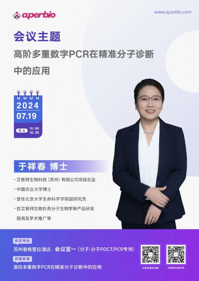 艾普拜生物于祥春博士將于7月19日16點(diǎn)會議室一(分子-分子POCT/PCR專場),基于數(shù)字PCR平臺和多種多重檢測技術(shù),跟大家分享主題為:高階多重數(shù)字PCR在精準(zhǔn)分子診斷中的應(yīng)用,歡迎各位同仁專家學(xué)者蒞臨。