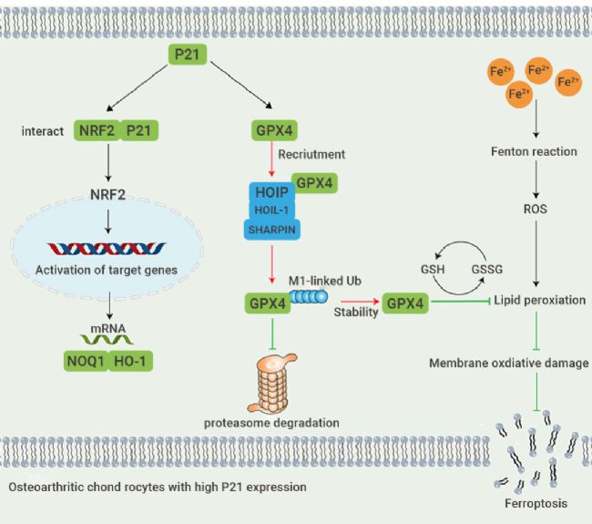 - P21 通過調(diào)節(jié) GPX4 蛋白穩(wěn)定性在 OA 中發(fā)揮抗鐵死亡作用,且該調(diào)節(jié)與 NRF2 無關(guān)。
