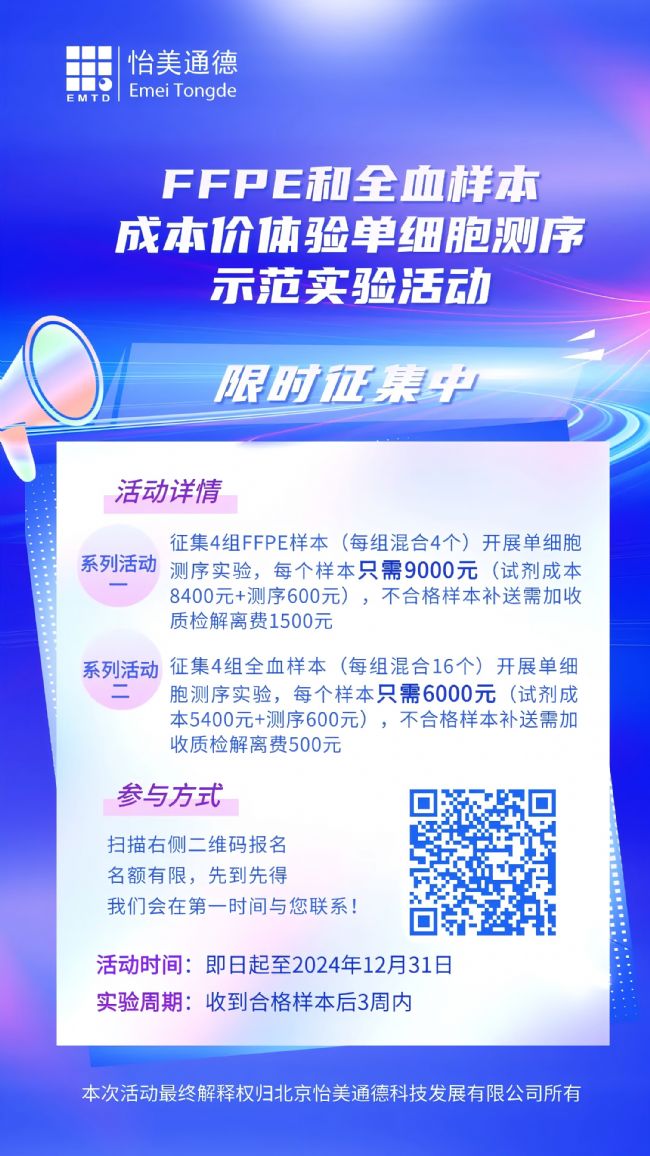 針對血液樣本和FFPE樣本做單細胞測序存在的各種問題,北京怡美通德科技發(fā)展有限公司現(xiàn)特推出“單細胞測序Flex新技術展示”系列征集活動,對客戶提供的真實樣本(FFPE或全血),用10x Flex固定的方法進行單細胞測序示范實驗,您只需用試劑和測序的成本價格,即可體驗單細胞測序,獲得高質量的數(shù)據(jù)結果,還可以來EMTD Demo Lab觀摩實驗過程。名額有限,先到先得!