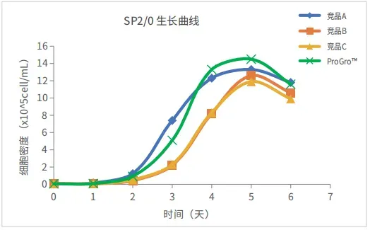 以0.06X10⁵cells/mL的密度將SP2/0細胞分別接種至添加不同品牌胎牛血清的培養(yǎng)基中培養(yǎng),ProGro™進口胎牛血清培養(yǎng)的SP2/0相對單細胞增值率優(yōu)于競品。