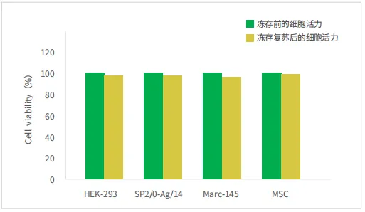 使用ProGro™國產胎牛血清分別培養(yǎng)不同細胞,測試其凍存前細胞活力以及凍存復蘇后細胞活力,前后細胞活力均表現(xiàn)優(yōu)秀。
