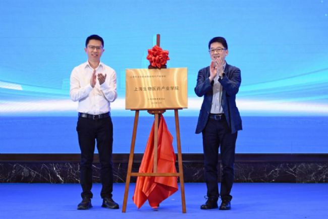 ▲市教委職教處處長馬建超、臨港新片區(qū)管委會發(fā)改處副處長莊青松共同為上海生物醫(yī)藥產(chǎn)業(yè)學院和生命藍灣產(chǎn)教聯(lián)合教學基地揭牌