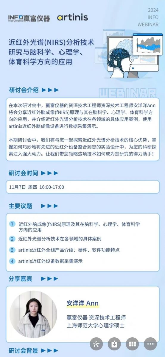 11月7日下午4點(diǎn)舉行線上研討會(huì),我們的資深技術(shù)工程師安洋洋Ann將會(huì)分享近紅外腦成像(fNIRS)原理與其在腦科學(xué)、心理學(xué)、體育科學(xué)方向的應(yīng)用,我們將與您一起探索近紅外光譜分析技術(shù)的核心優(yōu)勢(shì),掌握如何巧妙地將先進(jìn)的近紅外設(shè)備整合到您的實(shí)驗(yàn)設(shè)計(jì)中,為您的科研探索注入強(qiáng)大動(dòng)力。