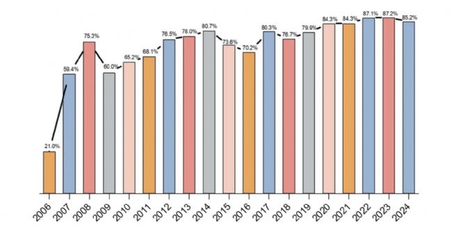 ▲生物制藥生產中的應用:在研發(fā)或生產的所有階段使用一次性生物反應器的受訪者百分比(2006-2024年)在2024年,一次性袋子 (87.6%)、接頭和卡箍 (87.6%) 以及一次性管路 (86.6%) 在所有設施中的使用率超過85%。