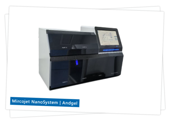 Andgel Mircojet NanoSystem is a patented device for the self-assembly of nanoparticles and/or microparticles, such as LNPs, liposomes, polymeric nanoparticles, magnetic nanoparticles, QDs, microballoons and microemulsions, to encapsulate nucleic acid drugs, peptipes/proteins, small molecules, contrast agents and quantum dots, etc.