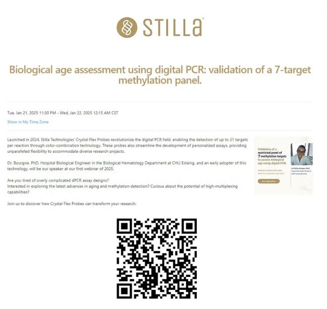 法國克萊蒙費(fèi)朗大學(xué)附屬醫(yī)院(CHU Estaing)血液生物學(xué)專家,Bourgne博士,為我們分享基于我們Stilla數(shù)字PCR技術(shù)平臺和Crystal Flex Probes的高階多重?cái)?shù)字PCR方法——7靶點(diǎn)甲基化Panel評估生物學(xué)年齡。