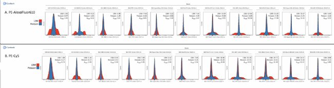 除了泊松算法,系統(tǒng)也支持LSM算法解析。采用40色panel進行精細免疫亞群分型,CytoFLEX mosaic可以成功檢測至少40個獨特的光譜特征曲線,更延續(xù)了CytoFLEX高靈敏度的特點。