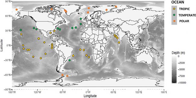 索邦大學(xué)的研究團隊使用MultiNet(浮游生物連續(xù)采樣網(wǎng),德國,HYDRO-BIOS公司)和UVP5(水下顆粒物和浮游動物圖像原位采集系統(tǒng),法國,HYDROPTIC公司)兩種設(shè)備在全球的57個站位(圖1)采集了浮游生物數(shù)據(jù)。
