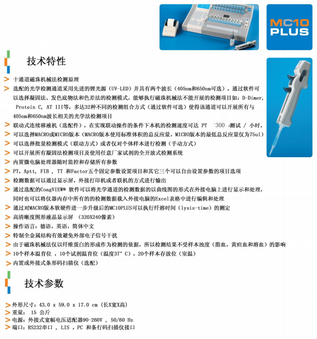 由于市場的需要我方從 2004 年開始研發(fā)具有獨(dú)立知識(shí)產(chǎn)權(quán)的MERLIN 系列半自動(dòng)系列血凝儀包括單通道(MC1),四通道(MC4)和十通道(MC10)三種機(jī)型,所有儀器均采用了由“Amelung'公司首創(chuàng)的磁珠機(jī)械法檢測(cè)原理,通過對(duì)于儀器軟硬件的一系列開發(fā)使得這種經(jīng)典的檢測(cè)原理能夠全面滿足當(dāng)前實(shí)驗(yàn)室對(duì)于凝血檢測(cè)的要求。另外選配的光學(xué)檢測(cè)通道由我方委托瑞士專業(yè)公司開發(fā)和制造,可以選裝在所有型號(hào)的儀器上(MC1PLUS , MC4PLUS 和 MC10PLUS)。該光學(xué)檢測(cè)通道采用先進(jìn)的鋰光源(UV-LED)并具有兩個(gè)波長(405nm和650nm可選)。通過軟件可以選擇凝固法、發(fā)色底物法等檢測(cè)模式,能夠執(zhí)行磁珠機(jī)械法不能開展的檢測(cè)項(xiàng)目如:D-Dimer, Protein C, AT III等,從而為用戶使用一臺(tái)儀器執(zhí)行所有凝血項(xiàng)目的檢測(cè)提供了解決方案,儀器自帶簡體中文界面, 用戶可以自行安裝和調(diào)試。有關(guān)儀器介紹的詳細(xì)內(nèi)容請(qǐng)瀏覽我們的網(wǎng)站: