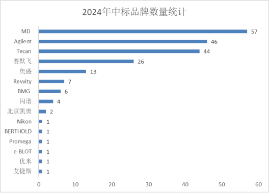 從中標(biāo)品牌數(shù)量來看,美谷分子、安捷倫、帝肯、賽默飛,在多功能酶標(biāo)儀領(lǐng)域斷層式領(lǐng)先。