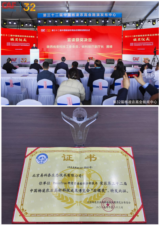 近日,以“新質(zhì)生產(chǎn)力 農(nóng)業(yè)新未來(lái)”為主題的第三十二屆中國(guó)楊凌農(nóng)業(yè)高新科技成果博覽會(huì)在陜西楊凌盛大開幕。被譽(yù)為農(nóng)業(yè)領(lǐng)域“奧斯卡”獎(jiǎng)項(xiàng)的后稷獎(jiǎng)評(píng)選結(jié)果也于10月26日下午重磅發(fā)布,由北京易科泰生態(tài)技術(shù)有限公司自主研發(fā)的“PhenoTron種質(zhì)資源檢測(cè)分析技術(shù)”,從468項(xiàng)農(nóng)業(yè)科技項(xiàng)目中脫穎而出,榮膺后稷獎(jiǎng),成為繼“UAS-4專業(yè)無(wú)人機(jī)遙感平臺(tái)”、“FluorTron多功能高光譜成像技術(shù)”之后,易科泰自主研發(fā)技術(shù)第三次斬獲該獎(jiǎng)項(xiàng)。