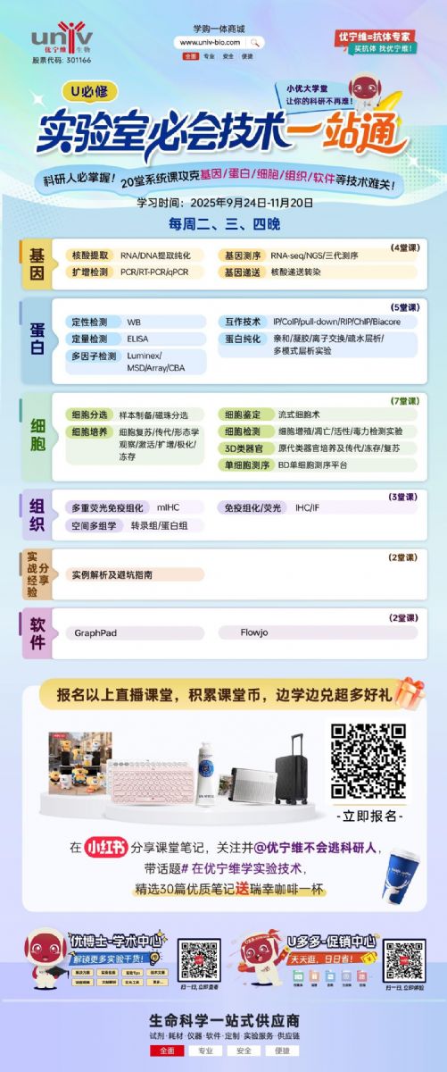剛進入科研領(lǐng)域,是不是總擔心實驗操作不熟練拖慢進度?別著急!《實驗室必會技術(shù)一站通》來啦,幫你系統(tǒng)攻克基因、蛋白、細胞、組織、軟件等核心技術(shù)難關(guān),并可贏取課堂幣兌換打印機、行李箱、線條小狗盲盒等大獎!