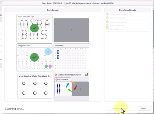 MyraVision®:視覺識別與確認(rèn)。利用計算機(jī)視覺技術(shù)理解工作臺面布局,自動檢測缺失的耗材(如槍頭、板位),并確認(rèn)實(shí)驗(yàn)設(shè)置是否正確(如試管蓋是否打開)。用戶只需一鍵掃描,即可輕松回答“我的槍頭夠嗎?”“管子蓋打開了嗎?”“耗材放對了嗎?”等關(guān)鍵問題,極大減少人為設(shè)置錯誤。Workbench 2.0的到來,標(biāo)志著自動化實(shí)驗(yàn)正式邁入智能感知與自主決策的新紀(jì)元。