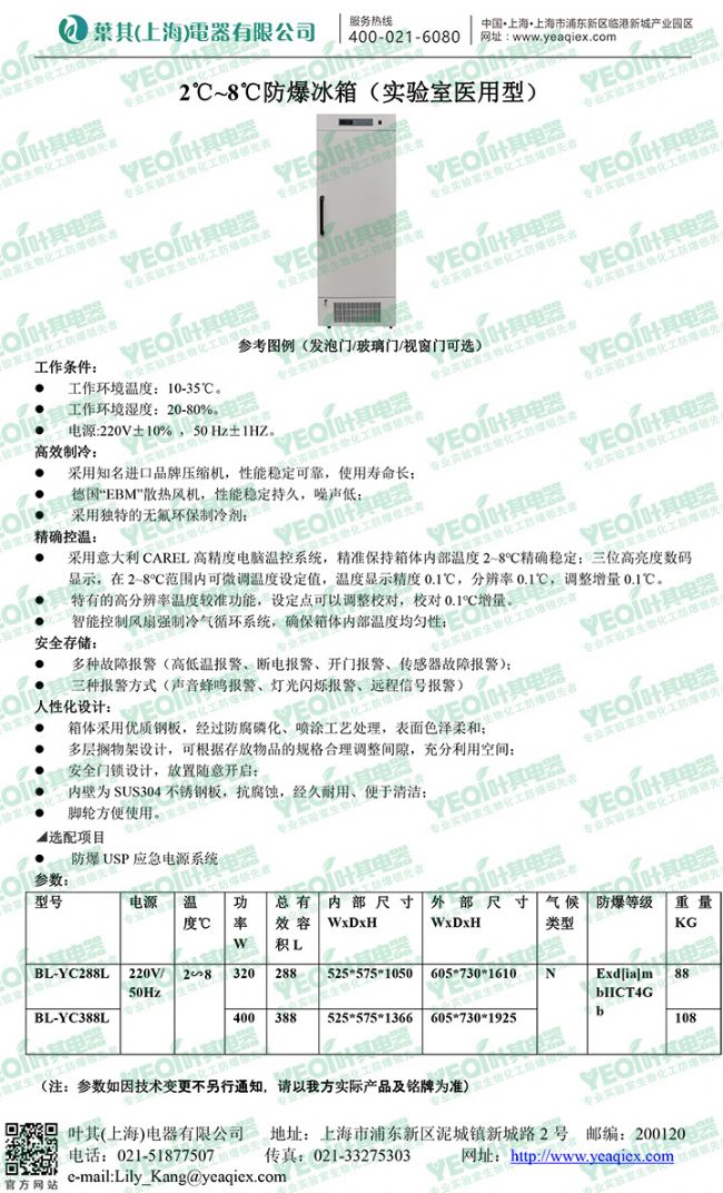 對(duì)于需要低溫保存的危險(xiǎn)化學(xué)試劑,比如乙醚、丙酮、石油醚易燃易爆易揮發(fā)物品等,必須要放到專門的具有防爆功能的存儲(chǔ)設(shè)備中。防爆冰箱屬于特種冰箱,采用集成防爆技術(shù),按工業(yè)環(huán)境使用要求制造的防爆冷柜系統(tǒng)。近期,葉其電器推出2℃~8℃一體非改造避光型防爆冰箱(實(shí)驗(yàn)室醫(yī)用型),具體參數(shù)如下: