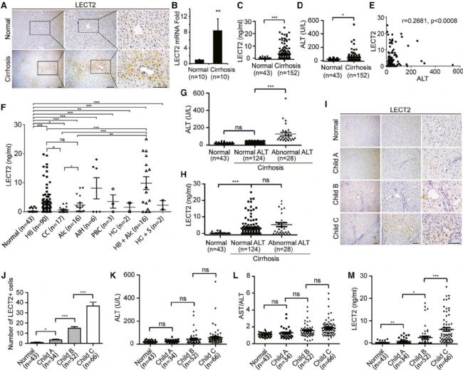 研究人員首先發(fā)現,臨床上肝硬化病人外周血中LECT2蛋白上調,且血清LECT2水平與肝纖維化肝硬化臨床分級高度相關(Fig.1),因此作者推斷血清中LECT2水平有作為肝硬化生物標志物的潛力。