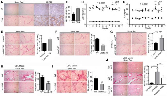 為了探究Lect2基因在肝纖維化過程中的重要作用,作者構建了CCL4誘導的肝纖維化模型。作者發(fā)現在正常的小鼠中,LECT2蛋白的含量很低,在肝纖維化模型小鼠中LECT2蛋白升高,且主要集中在肝損傷部位。