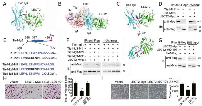 作者通過研究基因功能及蛋白結構發(fā)現,LECT2作為一種白細胞衍生的趨化因子,能夠與血管內皮細胞Tie1受體直接結合(Fig.4)。