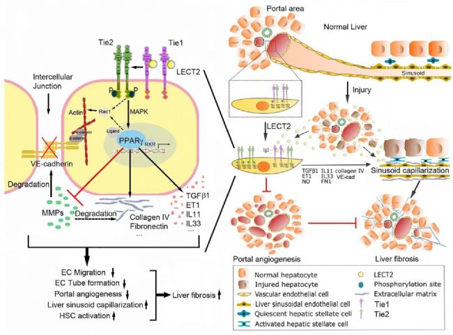 LECT2在與Tie1結合后,促進Tie1/Tie2異源二聚體解離,從而導致Tie2/Tie2同源二聚體增多,磷酸化增強,進而激活下游MAPK/PPAR/MMP/VE-cadherin信號通路,調控血管內皮細胞遷移和血管形成及肝纖維化進程(Fig.5)。