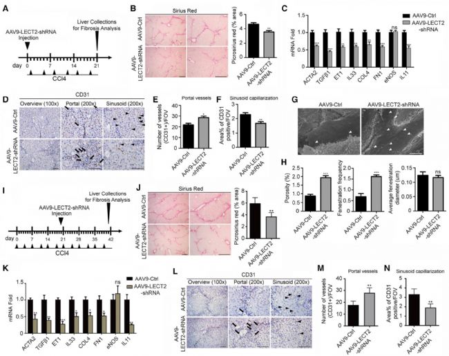最后作者通過體內研究表明,LECT2過表達抑制門靜脈血管生成,促進血竇毛細血管化,并促進纖維化,而這些變化在Lect2-KO小鼠中均被逆轉。用腺相關病毒敲低Lect2基因的表達能顯著降低肝纖維化,且LECT2的表達與晚期人肝纖維化分期相關(Fig.6)。