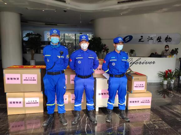 上圖為:藍(lán)天救援隊(duì)與之江生物總經(jīng)理邵俊斌交接物資