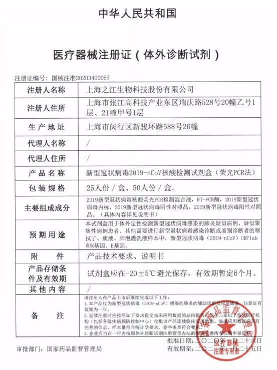 自此次疫情發(fā)生之初,之江生物便開始密切關(guān)注各地疫情,隨著疫情的發(fā)展,公司及時(shí)成立應(yīng)急小組,并基于公司在多次重大疫情爆發(fā)時(shí)所積累的技術(shù)沉淀和經(jīng)驗(yàn),快速成功研制出新型冠狀病毒(2019-nCoV)檢測(cè)試劑,一小時(shí)左右即可出具新型冠狀病毒核酸檢測(cè)結(jié)果,為疫情防控提供最快的信息反饋。1月26日,之江生物成為國(guó)內(nèi)首個(gè)獲得藥監(jiān)局批準(zhǔn)獲得三類醫(yī)療器械證書的新型冠狀病毒核酸試劑生產(chǎn)商(國(guó)械注冊(cè)證號(hào)為:20203400057)。