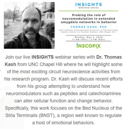 北卡羅來納大學(xué)教堂山分校鮑爾斯酒精研究中心的Thomas Kash博士舉辦的Inscopix Insight網(wǎng)絡(luò)研討會(北京時間5月5日2:00am)。Thomas Kash博士將討論他的團(tuán)隊(duì)使用Inscopix頭戴式顯微鏡(滔博生物中國區(qū)代理)最近的科研成果,以闡明肽和兒茶酚胺等神經(jīng)調(diào)節(jié)劑是如何改變細(xì)胞功能和改變行為的。他的網(wǎng)絡(luò)研討會將特別關(guān)注終紋床核(BNST),這是一個眾所周知的調(diào)節(jié)一系列情緒行為的區(qū)域。