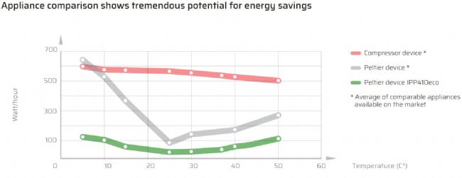 1、能效指數(shù)顯著提升。Memmert擁有數(shù)十年半導(dǎo)體箱體研發(fā)與生產(chǎn)經(jīng)驗,為了打造新旗艦產(chǎn)品,轉(zhuǎn)化吸納了Peltier技術(shù)的最新發(fā)展成果,在集成原有技術(shù)參數(shù)穩(wěn)定的基礎(chǔ)上,對能耗性能進行了大幅度革新,將IPPeco系列產(chǎn)品推向了新巔峰,“到現(xiàn)在,我們終于把Peltier模塊效率低下的難關(guān)攻克了”,Memmert研發(fā)總監(jiān)Philipp Schwarm解釋道。測試數(shù)據(jù)顯示,不僅ICH等法規(guī)要求的操作點,就是在其他工作區(qū)域內(nèi),Peltier模塊的能耗數(shù)據(jù)比之前均有顯著下降,產(chǎn)生更少的碳排放,碳足跡進一步縮小,故而Memmert IPPeco系列產(chǎn)品擁有了更大的市場優(yōu)勢。以IPP410ecoplus為例,額定功率僅為600W,穩(wěn)定后的運行功率會更低。