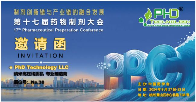 PhD Technology LLC 中國(guó)技術(shù)服務(wù)中心,將于2024年9月27日-29日,攜納米高壓均質(zhì)機(jī)(High Pressure Homogenizer)參加由中國(guó)藥學(xué)會(huì)主辦、中國(guó)藥學(xué)會(huì)藥劑專業(yè)委員會(huì)承辦的“第十七屆藥物制劑大會(huì)”。歡迎廣大客戶朋友前來參觀設(shè)備、洽談項(xiàng)目!
