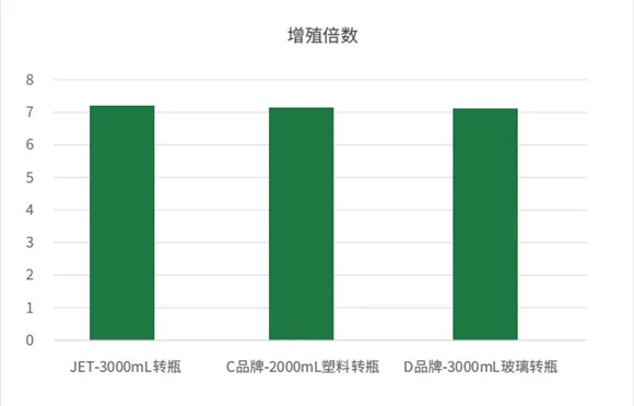 結(jié)果表明:在潔特生物3000mL細(xì)胞培養(yǎng)轉(zhuǎn)瓶中培養(yǎng)的Vero細(xì)胞單位面積收獲量和增殖倍數(shù)與國際知名品牌相當(dāng)。