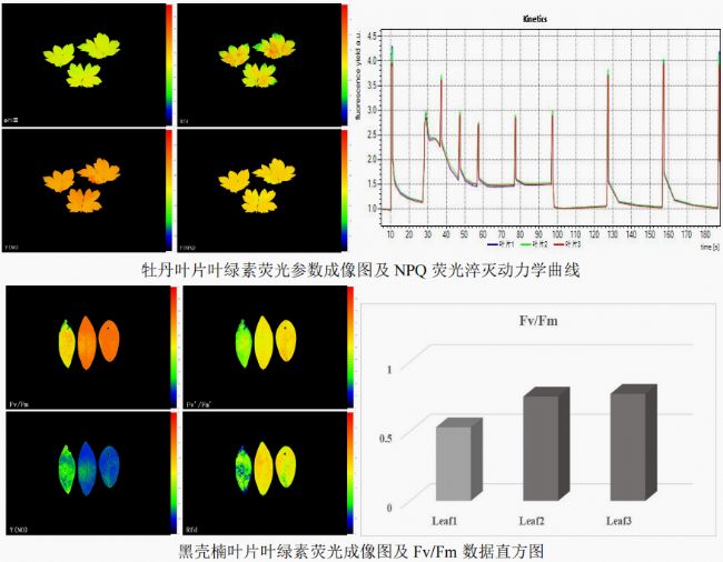 牡丹葉片三個(gè)葉片未做處理,生長(zhǎng)狀態(tài)接近,其整體光合活性之間無明顯差異,但葉片內(nèi)部不同部位光合性能存在差別,結(jié)果也體現(xiàn)了這種異質(zhì)性,這也是成像系統(tǒng)的優(yōu)勢(shì)所在。而黑殼楠三個(gè)葉片,Leaf1進(jìn)行了低溫處理,其Fv/Fm(暗適應(yīng)下的最大光量子通量,反映最大光合能力)明顯降低,說明其光合效率降低。Y(NO)(PSII處非調(diào)節(jié)性能量耗散的量子產(chǎn)量光合效率,是光保護(hù)的重要指標(biāo))明顯升高,說明其遭受了光損傷,光耐受能力下降。