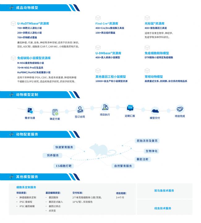 南模生物擁有經(jīng)驗豐富的模型定制團隊,可為客戶定制敲除、條件性敲除、點突變、人源化、敲入等多種類型的基因編輯小鼠。此外,南模生物擁有含上萬種成品小鼠的模型資源庫,基本覆蓋熱門基因的敲除/條件性敲除小鼠、免疫缺陷小鼠、靶點人源化小鼠、自發(fā)疾病小鼠、Cre/Dre 工具鼠、熒光示蹤小鼠等。